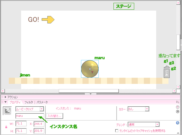 |maru7.swf | |キーボードで左右の方向キー押すと左右に動きます |上を押すと跳ねます |今回は不要調味料専用ゴミ箱に当たると跳ね返りますw 今回は今までかなーり忘れていたステージ(画面上)のムービークリップ(キャラ) について少し解説します。 参考画像 インスタンス: 目に見えるものだとボタンやムービークリップなどの種類があります 見えないものだと音とかですね こういうものを作る場合はムービークリップが多いかな インスタンス名は動かしたりするときに、どれか分かるようにしたいので 適切なインスタンス名を付けましょうw ムービークリップの中にムービークリップなどを作ることができます その場合のインスタンスの指定は.で区切ります (例えば調味料棚というオブジェクトの中にしょうゆというオブジェクトがあると 調味料棚.しょうゆ となります} ↓さて。スクリプト(初期値設定とfunctionの一部を省略)↓ //バグの原因となる/1.2などを削除(あると跳ね返った後ろにゴミ箱が出てきますw) function f_gomi() { now_maru += now_r; g1._x = now_maru%2000+700; g2._x = now_maru%2000+1200; g3._x = now_maru%2000+1900; go._x += now_r; } //ゴミ箱との当たり判定「hitTest」 //if( 調味料ゴミ箱 .hitTest(不要物) ){ 蓋を開ける } //↑ifで判断させると「もし調味料ゴミ箱が不要物とぶつかっていれば蓋を開ける」 //となります //「eval」は文字と変数を組み合わせて変数として認識させることもできます //変数(ここではgnumに1~4の数字が入る) //g1、g2...になり、そこの中にあるgomiというインスタンスと //maruの中にあるmaruというインスタンスの当たり判定を調べます //処理内容は進もうとしていた最終地点の*1.6倍戻されますw //乗っかるとぽんぽん上に跳ねて戻らなくなると困るので+20移動 function f_ghit(gnum) { if (eval("g"+gnum).gomi.hitTest(maru.maru)) { end_ri = end_ri-(end_ri-ri)*1.6+20; yi = -17; } } //「for」繰り返し処理です //for (しょうゆ=空; しょうゆ<皿の半分; しょうゆを足す){ 瓶を傾ける } //最初しょうゆが空で始まり皿の半分になるまでしょうゆを足していきます //足している間は、瓶を傾け続けろ!という処理です //「function」他のところで設定した処理をここで行う // 実行内容が 調味料( 塩 ) // functionが 調味料 ( 入れるもの ){ 瓶=入れるもの } //そうするとfunctionが 調味料( 塩 ){ 瓶=塩 } として実行されます //“入れるもの”がある場所の値を引数といいます //ここでは毎回足されていく数値をf_ghitの引数に入れ //f_ghitの処理のevalで結合されg1の、1とか2の部分になります this.onEnterFrame = function() { f_ri(); f_yi(); f_jimen_x(); f_gomi(); f_kd_lis(); for (gi=1; gi<4; gi++) { f_ghit(gi); } }; それではいつものように感想とか 質問や指摘がありましたらコメントをお願いします |